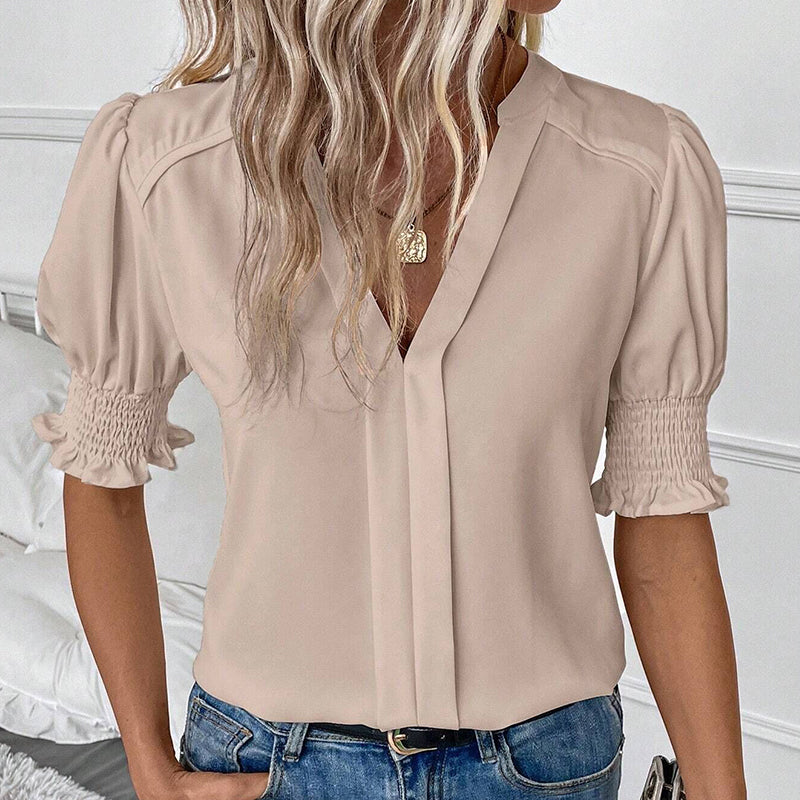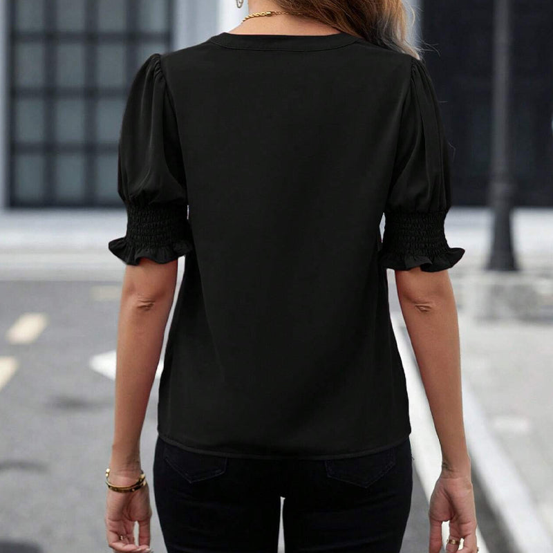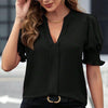 👚✨Fă cunoștință cu noul tău must-have de sezon: cămașa noastră Puff Ruffle cu mânecă scurtă! Perfectă pentru ținute formale și casual, această bluză cu decolteu în V și detalii cu manșete este adaptabilă pentru toate vârstele și tipurile de corp.🌸