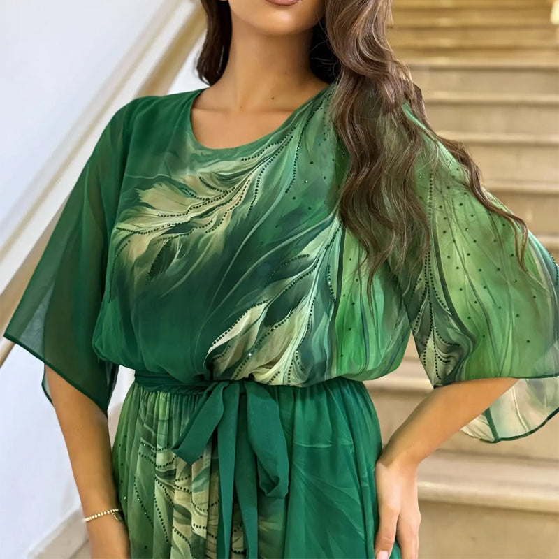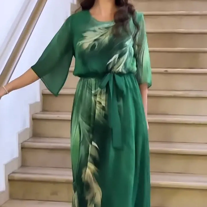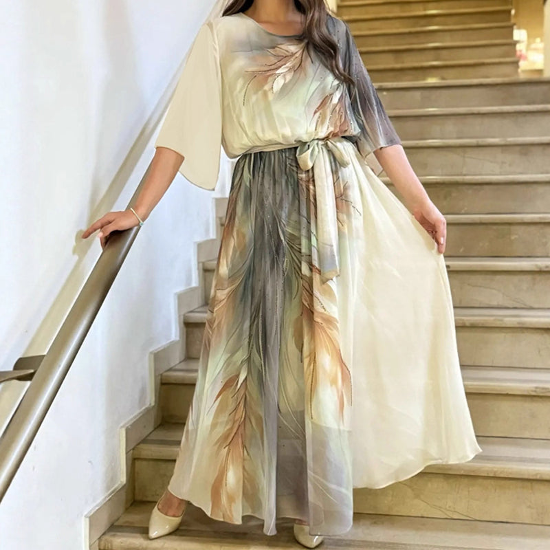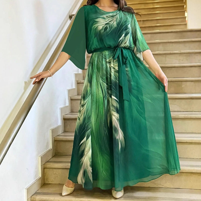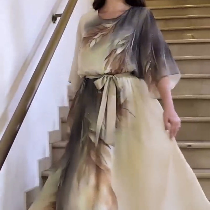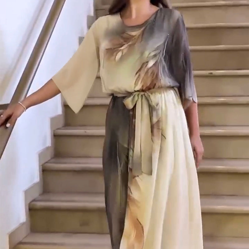 Design elegant și fluid - Cu silueta sa fluidă și imprimeul neregulat unic, această rochie extra-lungă cu gât rotund este un look sofisticat și elegant atât pentru ocazii casual, cât și formale. Țesătura sa ușoară asigură confort și stil pe tot parcursul zilei.