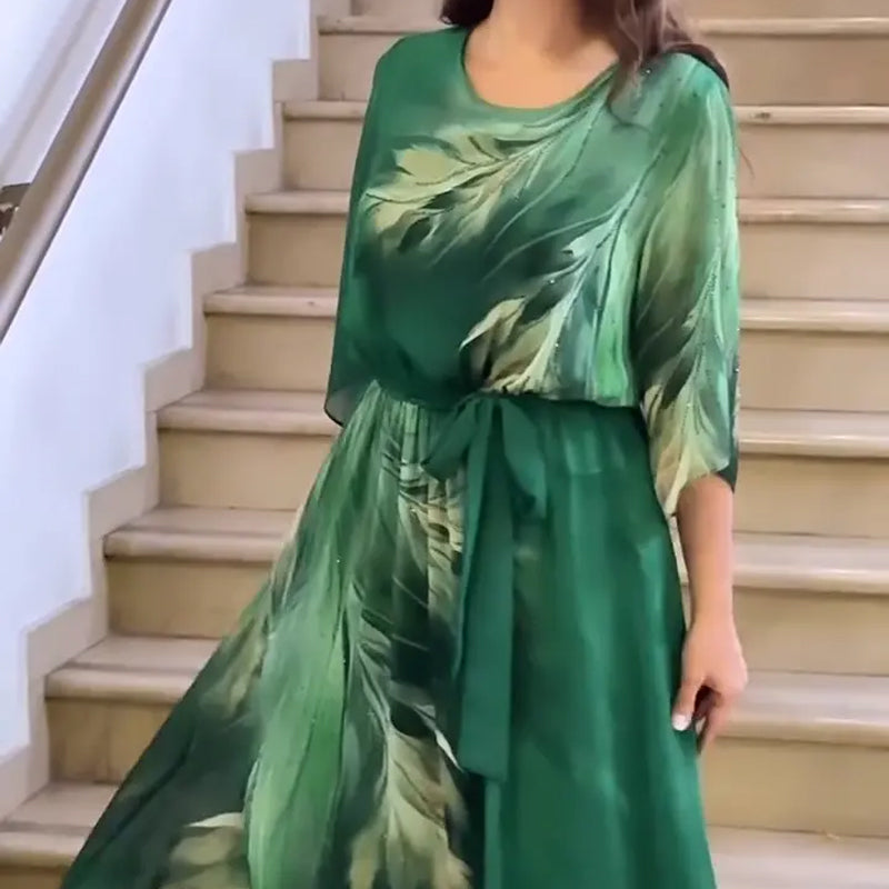 Pachetul include 1 x rochie imprimată cu decolteu rotund și curea