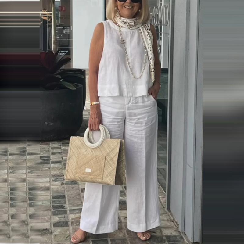 Un design clasic, dar șic. Decolteul rotund și tricoul fără mâneci se potrivesc cu pantalonii cu picioare largi pentru a crea un look modern și elegant.